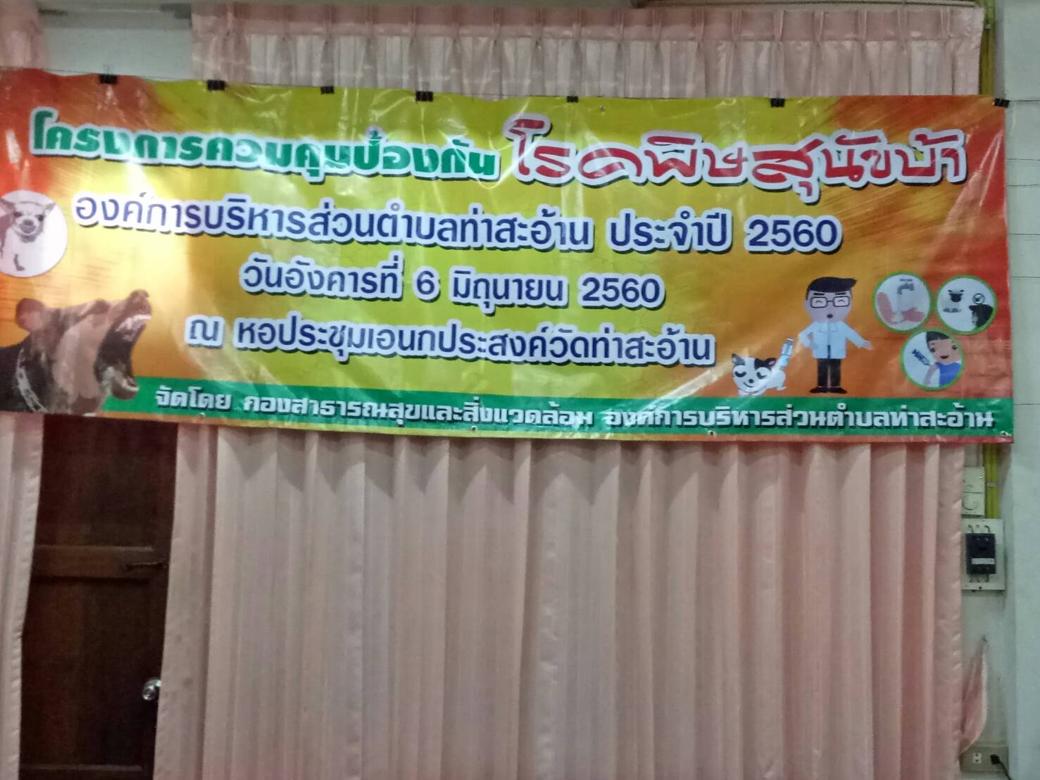 เมื่อวันอังคารที่ 6 มิถุนายน 2560 องค์การบริหารส่วนตำบลท่าสะอ้าน ได้จัดโครงการควบคุมป้องกันโรคพิษสุนัขบ้า ณ หอประชุมเอนกประสงค์วัดท่าสะอ้าน โดยมีเจ้าหน้าที่จากกลุ่มพัฒนาสุขภาพสัตว์ ร่วมให้ความรู้เกี่ยวกับโรคพิษสุนัขบ้าแก่ประชาชน และให้บริการฉีดวัคซีนป้องกันโรคพิษสุนัขบ้า ให้กับสุนัขและแมว จำนวน 116 ตัว